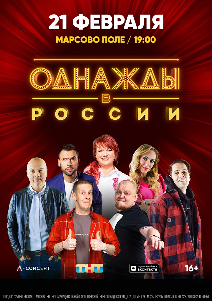 Шоу «Однажды в России» – это сборник сатирических скетчей, которые уже 9 лет являются одним из самых рейтинговых передач на ТНТ. На сцене Вас ждет программа без антракта, состоящая из отборных шуток на злобу дня.
