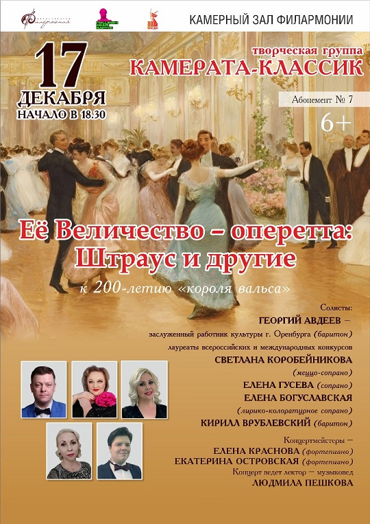 17 декабря в Камерном зале филармонии состоится концерт «Ее Величество – оперетта: Штраус и другие» творческой группы «Камерата-Классик», приуроченный к 200-летию «короля вальса»