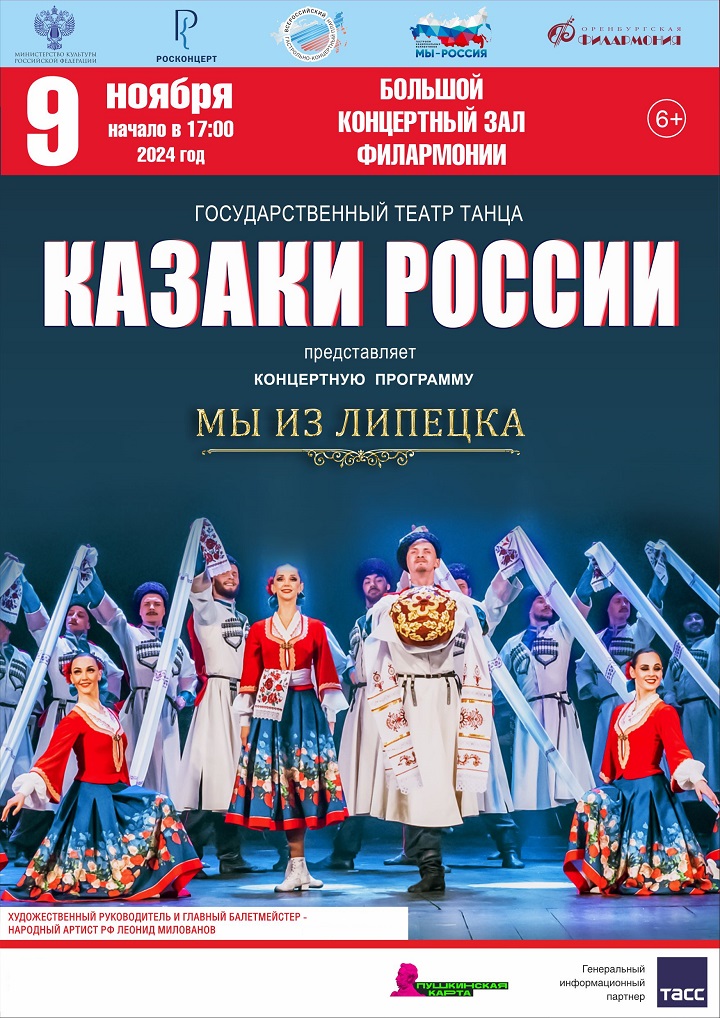 9 ноября в Большом концертном зале филармонии Государственный театр танца “Казаки России” выступит с концертной программой "Мы из Липецка". Художественный руководитель и главный балетмейстер - народный артист РФ Леонид Милованов.