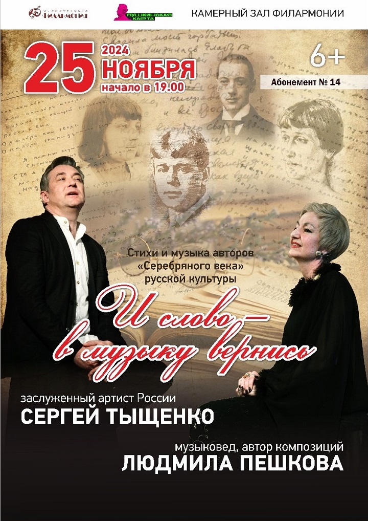 Всем известно высказывание немецкого поэта-романтика Генриха Гейне: «Там, где кончаются слова, начинается музыка». Тайну и очарование совместного звучания и восприятия Музыки и Поэзии — двух этих муз древнегреческого Парнаса — знали поэты и музыканты «Серебряного века» русской культуры. Они устраивали вечера, где ввели «мелодекламацию» - жанр, и поныне пользующийся всё возрастающим интересом у публики и исполнителей. Не случайно в программе первого концерта абонемента № 14 – стихи о музыке поэтов «Серебряного века» Блока и Гумилёва, Цветаевой и Ахматовой, Мандельштама и Саши Чёрного... Фоном к их изумительным стихам прозвучит музыка, которую они знали, любили и воспевали — музыка их современников Глазунова, Скрябина, Прокофьева, Рахманинова; романсы Харито, Борисова, Абаза, Булахова, Фомина.