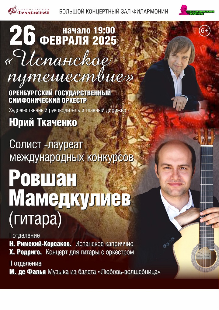 26 февраля в Большом концертном зале филармонии состоится концерт "Испанское путешествие" Оренбургского государственного симфонического оркестра, художественный руководитель и главный дирижер - заслуженный артист России Юрий Ткаченко, солист - лауреат международных конкурсов Ровшан Мамедкулиев (гитара).
