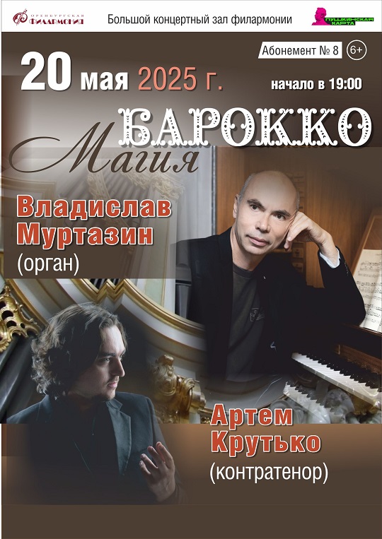 20 мая в Большом концертном зале филармонии органист, народный артист Республики Башкортостан Владислав Муртазин и контртенор, солист Мариинского театра Артем Крутько из Санкт-Петербурга представят программу «Магия барокко». В программе – светская и духовная музыка этого стиля.