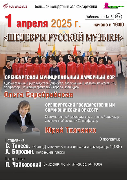 1 апреля в Большом концертном зале состоится концерт "Шедевры русской музыки" Муниципального камерного хора, художественный руководитель, дирижёр, заслуженный деятель искусств РФ, профессор, Почётный гражданин города Оренбурга Ольга Серебрийская, и Оренбургского государственного симфонического оркестра, художественный руководитель и главный дирижер – заслуженный артист России профессор Юрий Ткаченко.