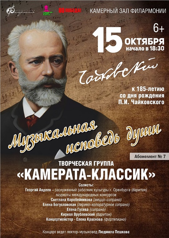15 октября в Камерном зале филармонии состоится концерт к 185-летию со дня рождения П.И. Чайковского "Музыкальная исповедь души" творческой группы "Камерата-классик".