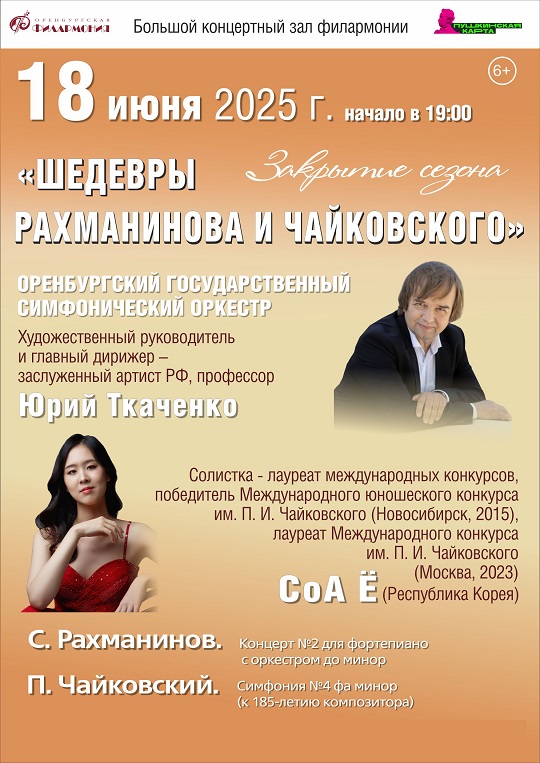 18 июня в Большом концертном зале филармонии состоится концерт-закрытие сезона "Шедевры Рахманинова и Чайковского" Оренбургского государственного симфонического оркестра, художественный руководитель и главный дирижер - заслуженный артист России профессор Юрий Ткаченко.