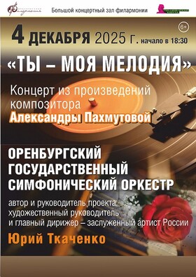 4 декабря в Большом концертном зале филармонии состоится концерт из произведений композитора Александры Пахмутовой "Ты - моя мелодия" в исполнении Оренбургского государственного симфонического оркестра.