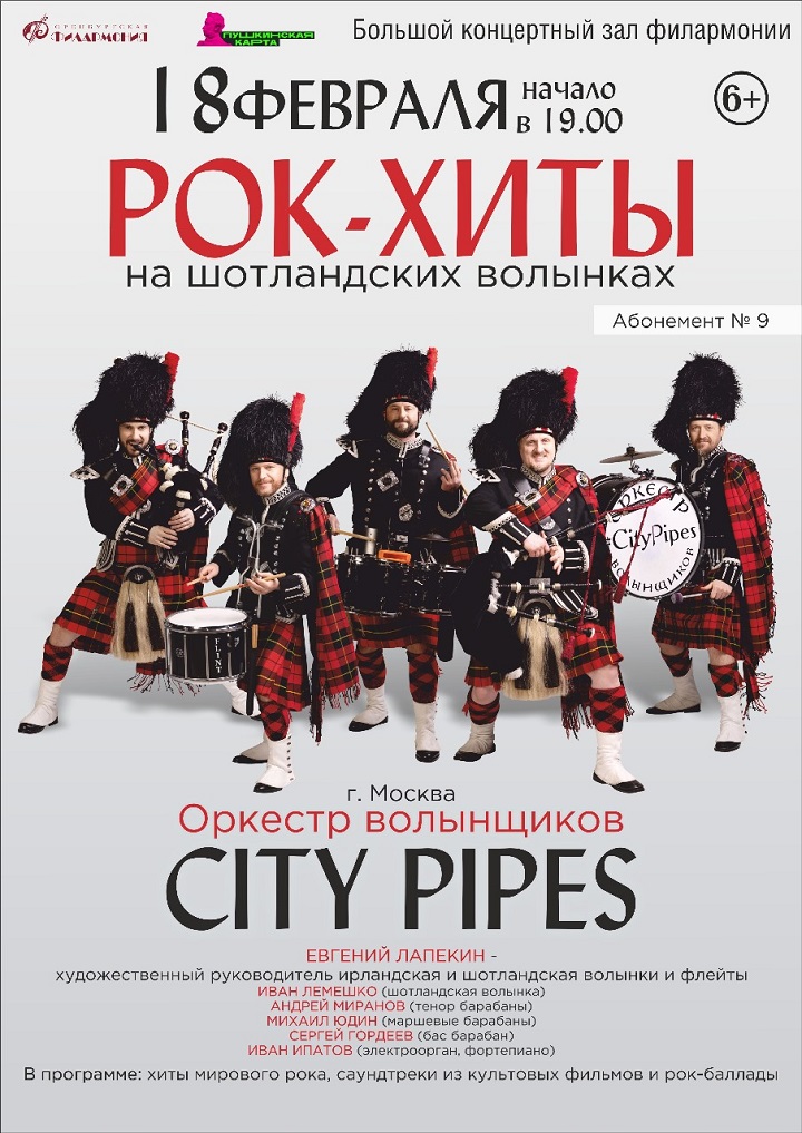 18 февраля на сцене Большого концертного зала для зрителей выступит Оркестр волынщиков City Pipes с программой "Рок - хиты на шотландских волынках".