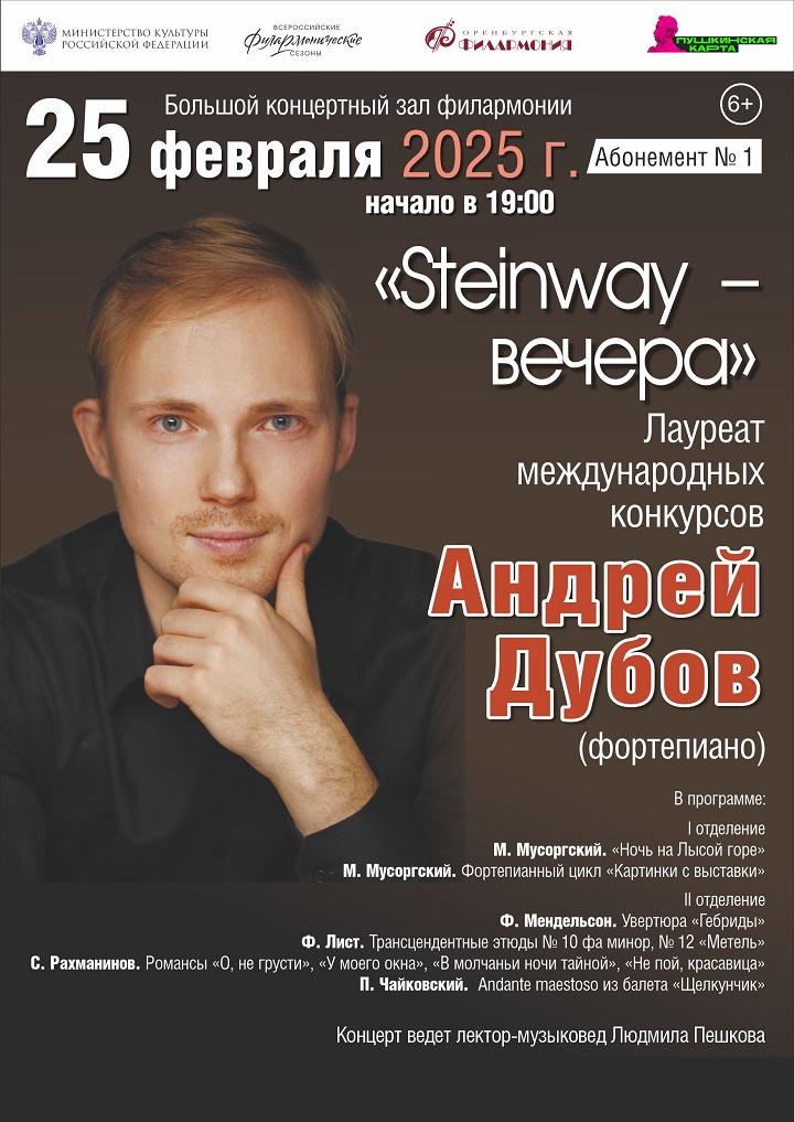 25 февраля в Большом концертном зале филармонии состоится концерт из абонемента № 1 "Stainway-вечера" лауреата международных конкурсов Андрея Дубова (фортепиано).