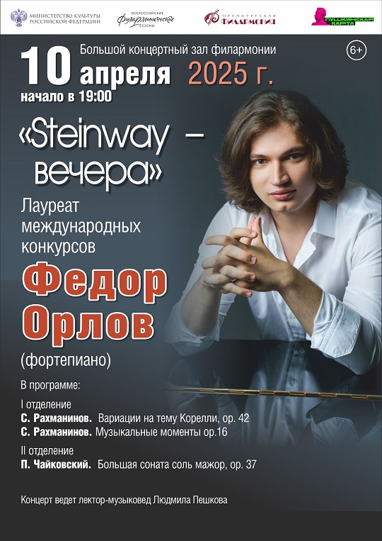 10 апреля в 19.00 в Большом концертном зале филармонии состоится концерт «Steinway – вечера» лауреата международных конкурсов Федора Орлова (фортепиано).