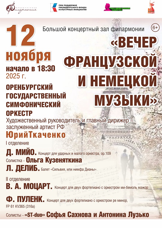 12 ноября в Большом концертном зале филармонии состоится концерт "Вечер французской и немецкой музыки" Оренбургского государственного симфонического оркестра.