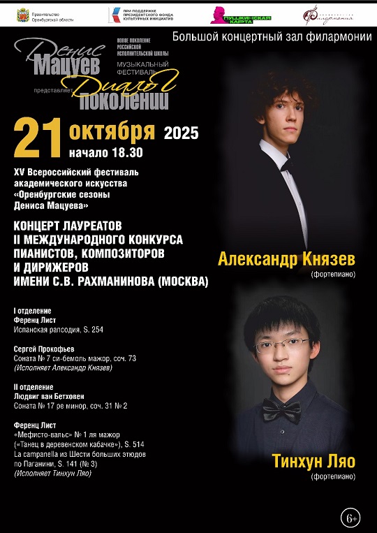 21 октября в рамках XV Всероссийского фестиваля академического искусства «Оренбургские сезоны Дениса Мацуева» состоится выступление лауреатов II Международного конкурса пианистов, композиторов и дирижёров имени С.В. Рахманинова — пианистов Александра Князева и Тинхуна Ляо.
