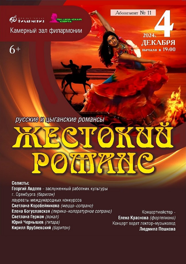 4 декабря в 19.00 в Камерном зале филармонии состоится концерт «Жестокий романс» творческой группы «Камерата-Классик» из абонемента №11.