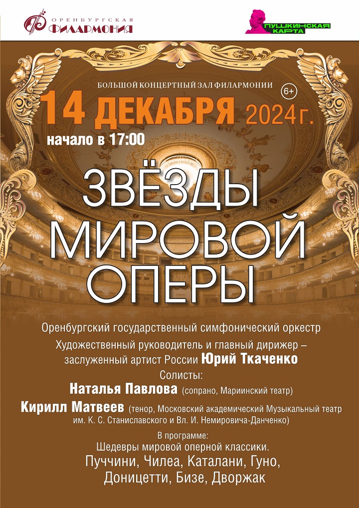 14 декабря в Большом концертном зале филармонии состоится концерт «Звёзды мировой оперы, солисты Мариинского и Большого театров» в исполнении Камерного оркестра Оренбургской областной филармонии и солистов Мариинского и Большого театров. Художественный руководитель и главный дирижер – заслуженный артист России Юрий Ткаченко.