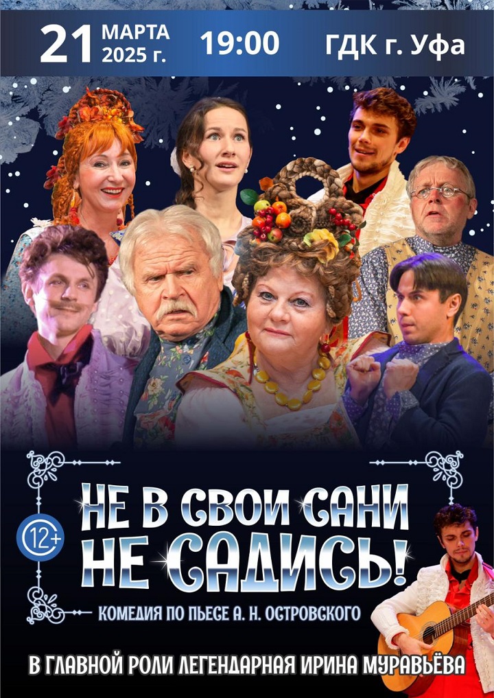 Искрометная комедия по пьесе А. Н. Островского «Не в свои сани не садись!» Неповторимый спектакль яркого режиссёра современности Романа Самгина (любимого ученика Марка Захарова) и прекрасного художника-сценографа Ольги Шагалиной несёт настоящее ощущение праздника, в котором нет места отчаянию, а только любви, честности и справедливости!